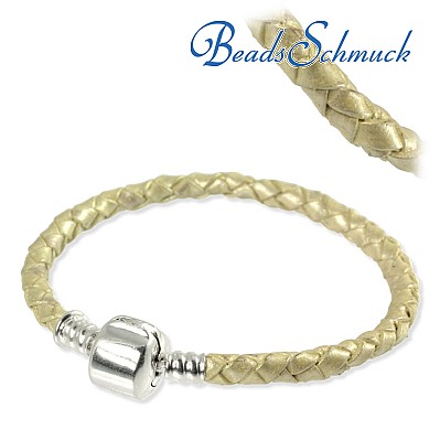 Ein Leder Armband geflochten in der Farbe perlmutt mit Sterling Silber 925er Clip Verschluss. Die Breite des Bandes ist 3mm und die Länge ist 19cm.